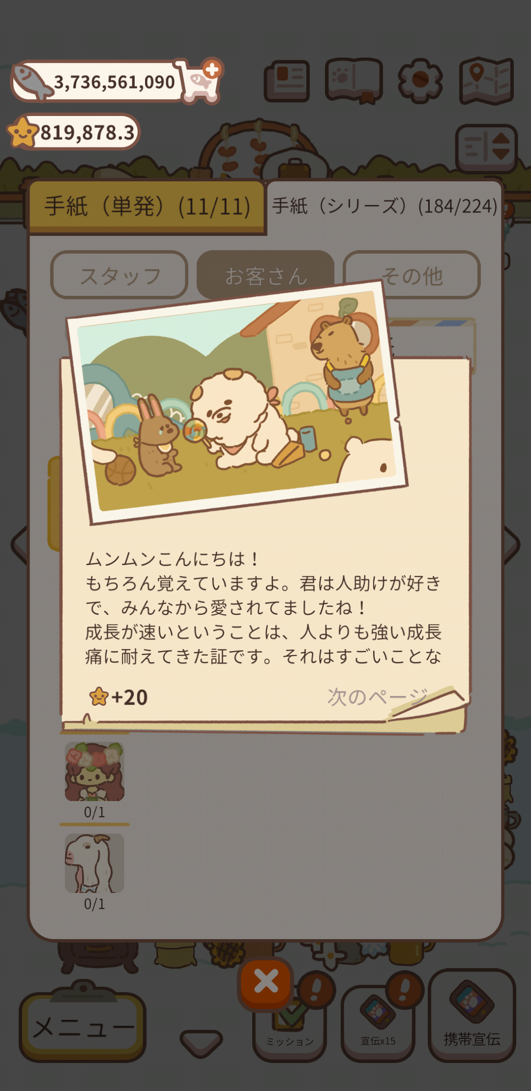 ムンムンの手紙のページの2つ目、「カピバラ先生の回答」が 銅のジョウロ、ブルーベル④、クローバー④ で来ました。